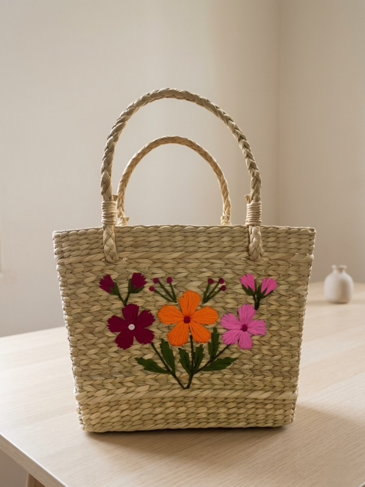 A beautifully handcrafted cane tote bag featuring vibrant floral embroidery that adds a lively and artistic touch. The natural woven texture is complemented by colorful flowers, creating a perfect blend of elegance and charm. Spacious and lightweight, this bag is ideal for everyday use, casual outings, or festive occasions, offering both style and practicality with a touch of traditional craftsmanship.