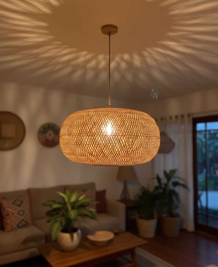 A beautifully crafted large round lamp that fills your space with a warm yellow glow. Its woven design creates soft light patterns, making it perfect for living rooms, dining areas, or spacious interiors. A bold yet elegant statement piece that adds warmth and natural charm to any setting.